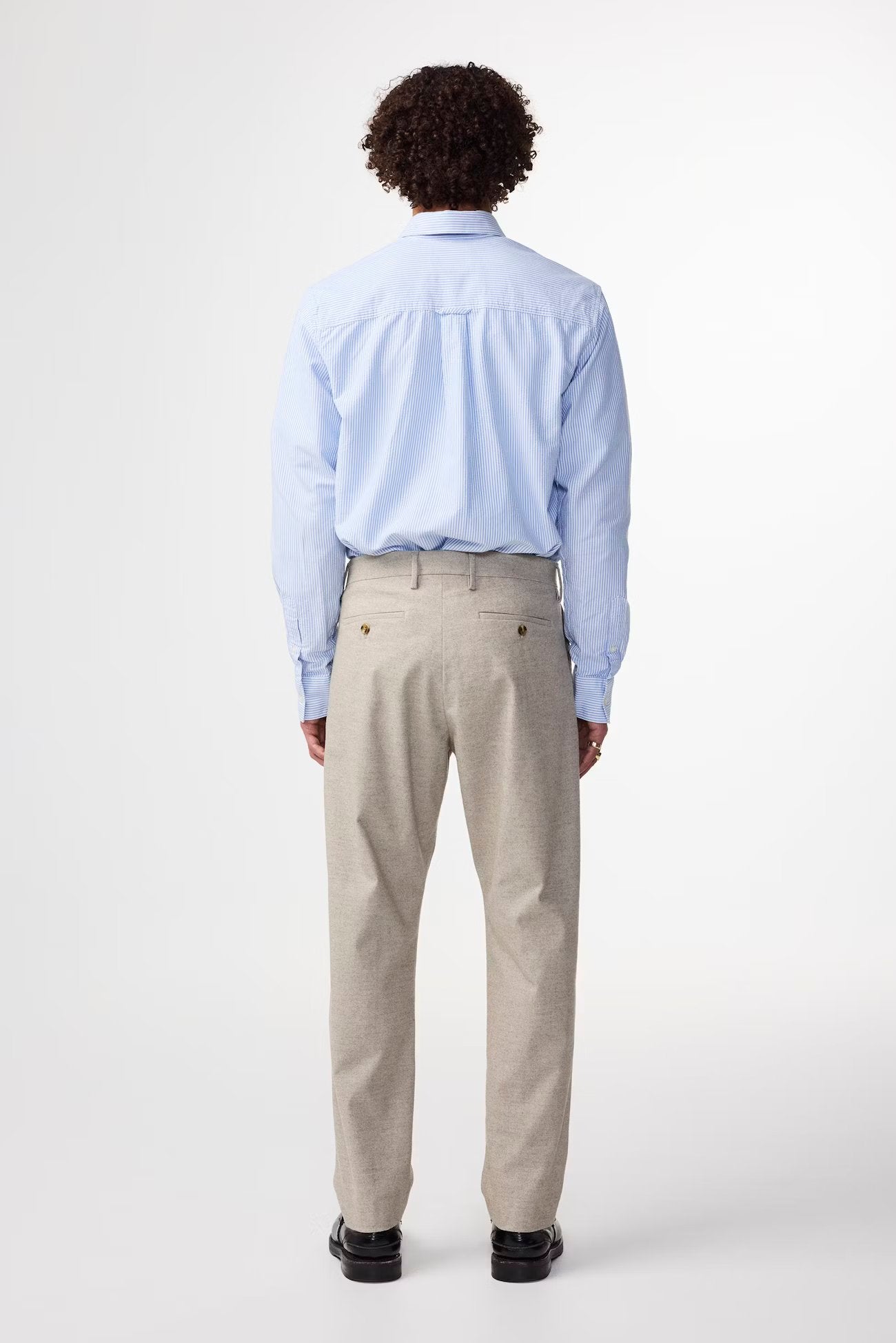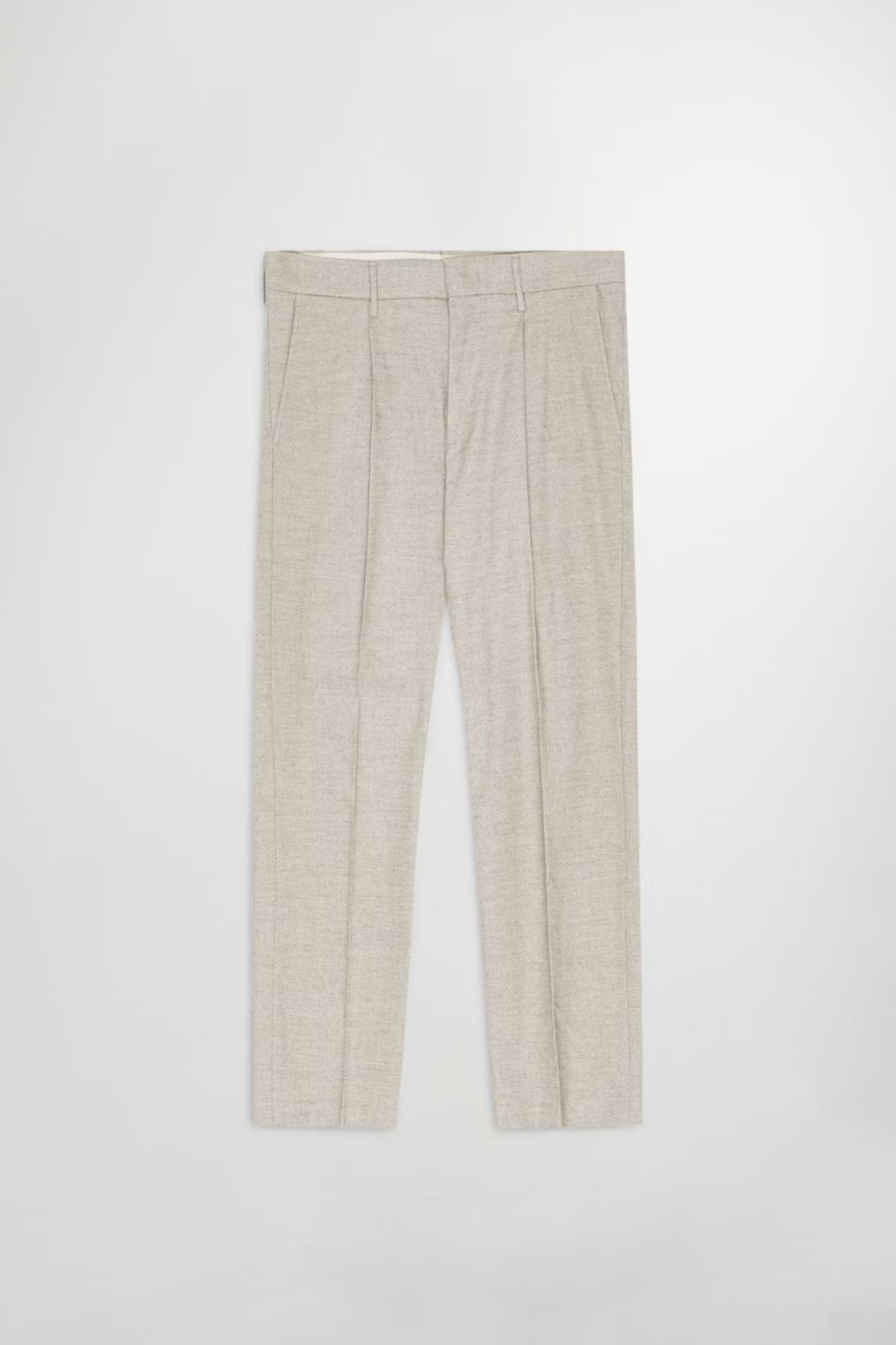 Den er også tidløs med regular fit og avsmalnende ben. Den er laget i en børstet melange twill-blanding med en touch av stretch for ekstra komfort. Designet er minimalistisk og sofistikert, med pressfolder, skjult lukking og earthhorn-knapper som gir et eksklusivt preg.