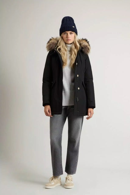 Denne jakken er en del av Woolrich sin arv, opprinnelig laget for å beskytte rørledningsarbeidere i Alaska mot tøffe vinterklima. Dette plagget er polstret med andedun og laget av Ramar Cloth, et vannavstøtende og vindtett stoff som gir en barriere mot regnbyger. Den er sjenerøst fylt med andedun for varme, og er forhøyet med luksuriøs pelskant på hetten for en ekstra behagelig og sofistikert følelse. Den slanke silhuetten er utstyrt med en rekke romslige lommer. Modellen har på størrelse Small.
